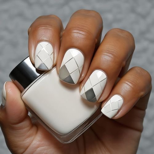 Silver Press on Nails Short Square Nails Glossy White Acrylic Nails with Plaid Line Design Squoval False Nails Full Cover on Nails for Women Girls Nails Decoration 24 Pcs